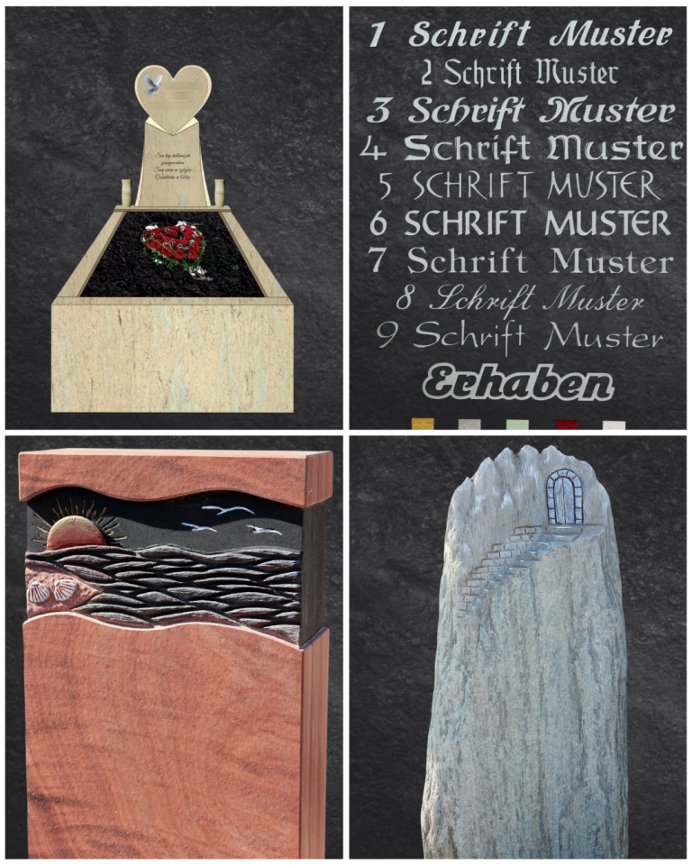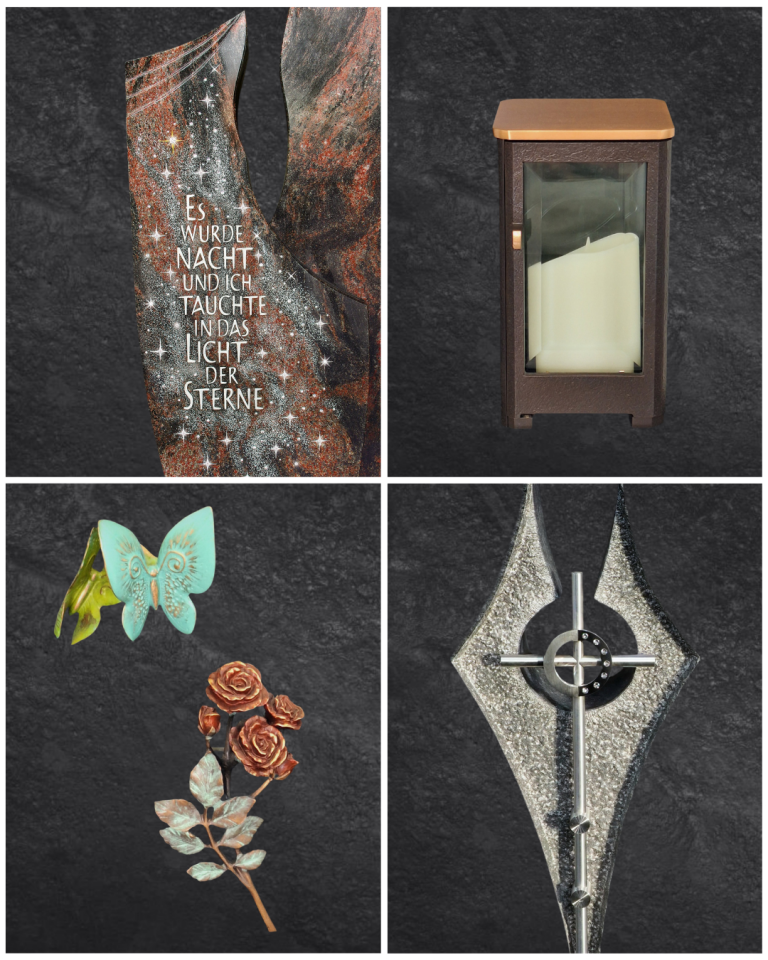 Die Möglichkeiten der Grabsteinveredelungen reichen von der originellen Beschriftung bis hin zur künstlerischen Gestaltung mit Swarovski-Kristallen. Sie erhalten bei uns Grabzubehör, wie Laternen, Vasen, Schalen und Ornamente aus Bronze, Aluminium oder Edelstahl.
